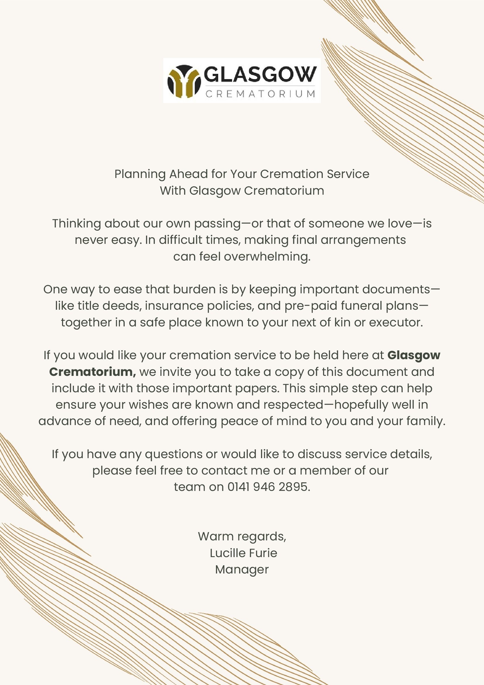 Those wishing to arrange a walk-through or orientation with our experienced team are warmly invited to contact the crematorium directly on 0141 946 2895 or by email at lucille.furie@glasgowcrematorium.co.uk or crem.staff@glasgowcrematorium.co.uk